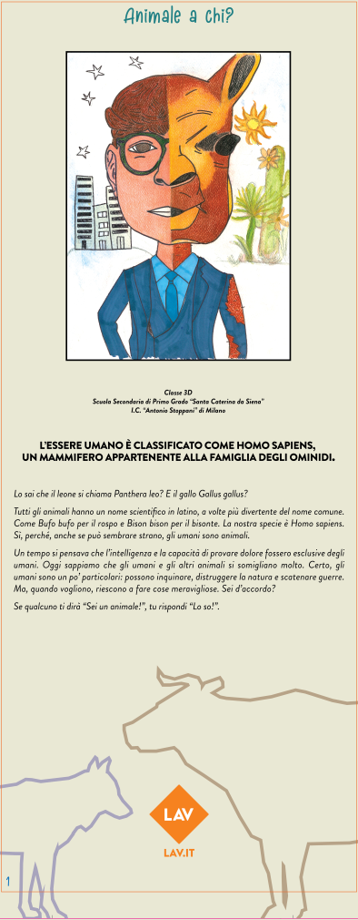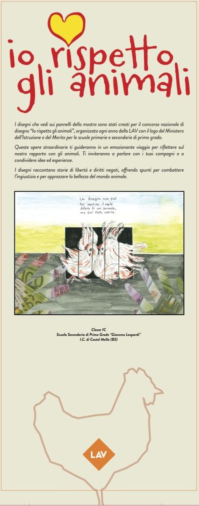 La mostra espone una selezione di disegni del concorso “Io rispetto gli animali”, accompagnati da testi che stimolano riflessioni e accendono il pensiero critico. Si compone di pannelli progettati per essere esposti negli edifici scolastici, rendendoli accessibili a studenti e docenti. Questo progetto non solo celebra la creatività dei giovani artisti, ma promuove anche un messaggio fondamentale: il rispetto per gli animali. Attraverso l’interpretazione dell’antispecismo e dei principi della LAV, i ragazzi sono invitati a riflettere sul loro rapporto con il mondo animale.